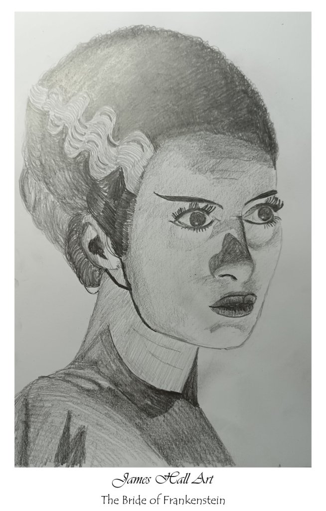 So, to keep my previous drawing of Frankenstein company, I conjured up the Bride of Frankenstein.